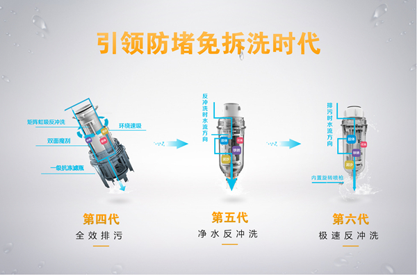 此次榮事達(dá)智能前置過(guò)濾器系列所帶來(lái)的最大不同,便是其獨(dú)有的“防堵免拆洗技術(shù)”。作為企業(yè)定向研發(fā)的專利技術(shù),有效解決了前三代傳統(tǒng)前置過(guò)濾器“易堵塞,拆洗難”的致命弊病,五款新品從第四代到第五代再到第六代,可以說(shuō)是防堵免拆洗技術(shù)的梯度升級(jí)。