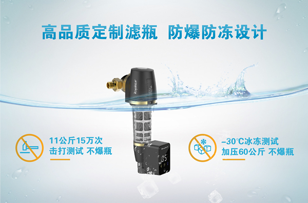 對(duì)于傳統(tǒng)前置過(guò)濾器來(lái)說(shuō)一直存在一個(gè)隱患,那就是在低溫冰凍或是高壓水錘等情況下,容易引發(fā)濾瓶爆裂,令許多用戶頭疼不已。其實(shí),回歸根本來(lái)說(shuō),還是因?yàn)闉V瓶材質(zhì)不佳。榮事達(dá)為攻克這一難題,可謂是下足功夫。智能前置過(guò)濾器濾瓶采用獨(dú)特配方和原裝進(jìn)口材料,不含雙酚A,濾瓶無(wú)注塑點(diǎn),并通過(guò)NSFSGS檢測(cè),經(jīng)過(guò)改性配方與防爆防凍極限抗壓測(cè)試,11公斤15萬(wàn)次擊打不爆瓶,-30℃冰凍測(cè)試加壓60公斤不爆瓶,濾瓶綜合性能有著質(zhì)的飛躍,保證用戶使用安心。