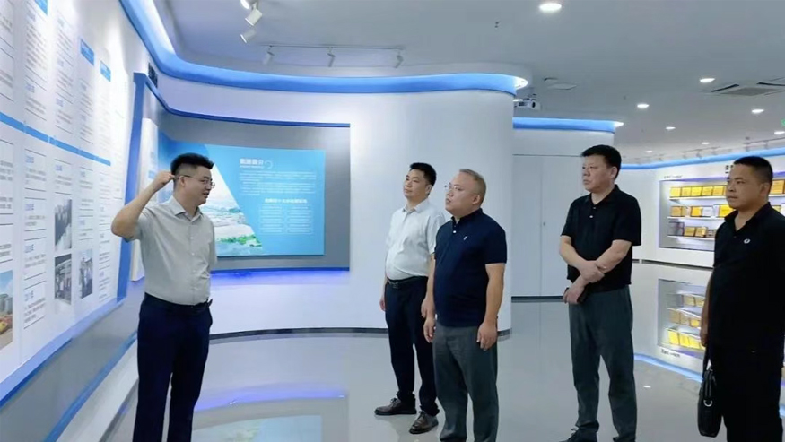 在智慧水世界展廳,總經(jīng)理王悅生向領(lǐng)導(dǎo)一行詳細(xì)介紹集團(tuán)的發(fā)展歷程、公益貢獻(xiàn)及黨建引領(lǐng)下的企業(yè)文化等。