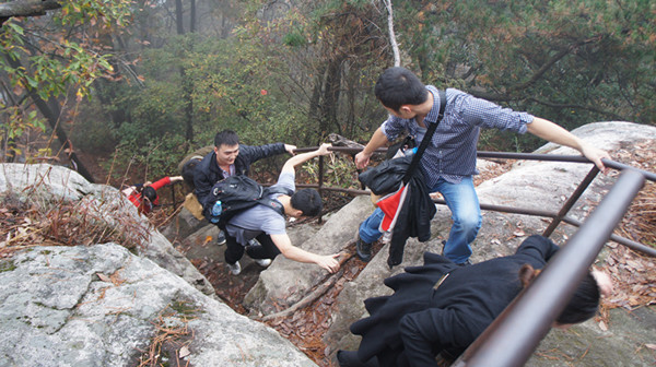到達(dá)目的地用過(guò)午餐,全體成員便整裝待發(fā),完成此次拓展訓(xùn)練最艱難的項(xiàng)目--攀登天屏峰。天屏峰海拔高度1605米,山峰險(xiǎn)峻、陡峭無(wú)比,全路段多為樹(shù)根、石塊堆出的小道,多處攀爬必須手腳并用,甚至要靠隊(duì)友幫助,攀登而上極為挑戰(zhàn)體能。