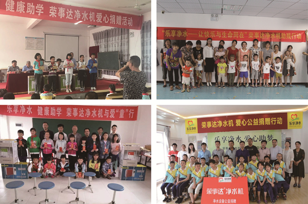 “樂(lè)享凈水.健康助學(xué)行動(dòng)”由榮事達(dá)水工業(yè)公司2011年發(fā)起,向貧困地區(qū)學(xué)校免費(fèi)提供直飲水設(shè)備,援建校園直飲水工程,開(kāi)展健康知識(shí)講座等志愿服務(wù),讓青少年兒童喝上健康衛(wèi)生的飲用水,同時(shí)樹(shù)立科學(xué)的飲水理念,幫助孩子茁壯成長(zhǎng)。