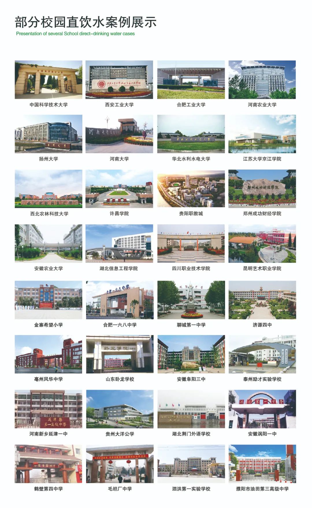 榮事達水工業(yè)先后承建了中國科學(xué)技術(shù)大學(xué)、河南大學(xué)、西北農(nóng)林科技大學(xué)、江蘇省丹陽市第五中學(xué)等3000多所學(xué)校的直飲水工程,‘喝’護千萬師生飲水健康。