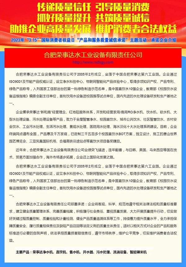 ☆ 《中國經(jīng)濟(jì)網(wǎng)》 http://12365.ce.cn/wcrd2023/76966.html ☆ 《中國產(chǎn)品質(zhì)量信譽(yù)網(wǎng)》 http://www.c315.cn/wcrd2023/76966.html 榮事達(dá)水工業(yè)公司將繼續(xù)做好產(chǎn)品和服務(wù),以質(zhì)量和口碑促進(jìn)品牌魅力的持續(xù)提升,為更多消費(fèi)者健康飲水提供優(yōu)質(zhì)服務(wù)。