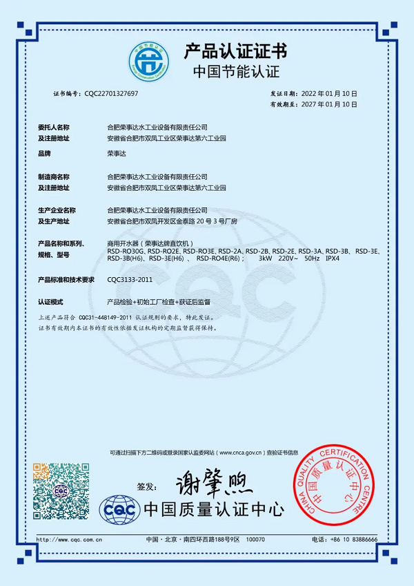 榮事達(dá)RSD-RO4E節(jié)能直飲機是中國節(jié)能認(rèn)證產(chǎn)品,產(chǎn)品采用節(jié)能熱交換技術(shù),在管式交換器內(nèi),過濾后的自來水吸收開水釋放的熱能升溫85℃左右,從而充分節(jié)省了降水燒開所需的電能和時間,有效改善了傳統(tǒng)飲水機的費時、費電的弱點。設(shè)備采用二開水二溫水設(shè)計,既滿足了員工泡茶的需求,也提供了即飲的溫水選項,極大地方便了員工的日常飲水。此外,設(shè)備采用先進(jìn)的RO反滲透技術(shù),有效濾除水中的泥沙、鐵銹、重金屬等雜質(zhì),出水可達(dá)直飲標(biāo)準(zhǔn)。