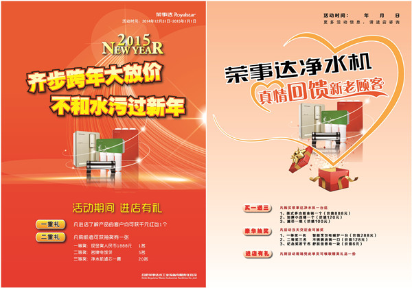 為普及凈水,元旦期間,榮事達(dá)將在全國多個(gè)省份推行惠民政策,加強(qiáng)推廣凈水機(jī)的力度。顧客在元旦期間進(jìn)店選購榮事達(dá)凈水機(jī),可獲得超值大禮。