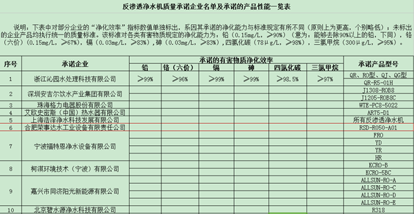 圖為部分反滲透凈水機質(zhì)量承諾企業(yè)名單及承諾的產(chǎn)品性能一覽表